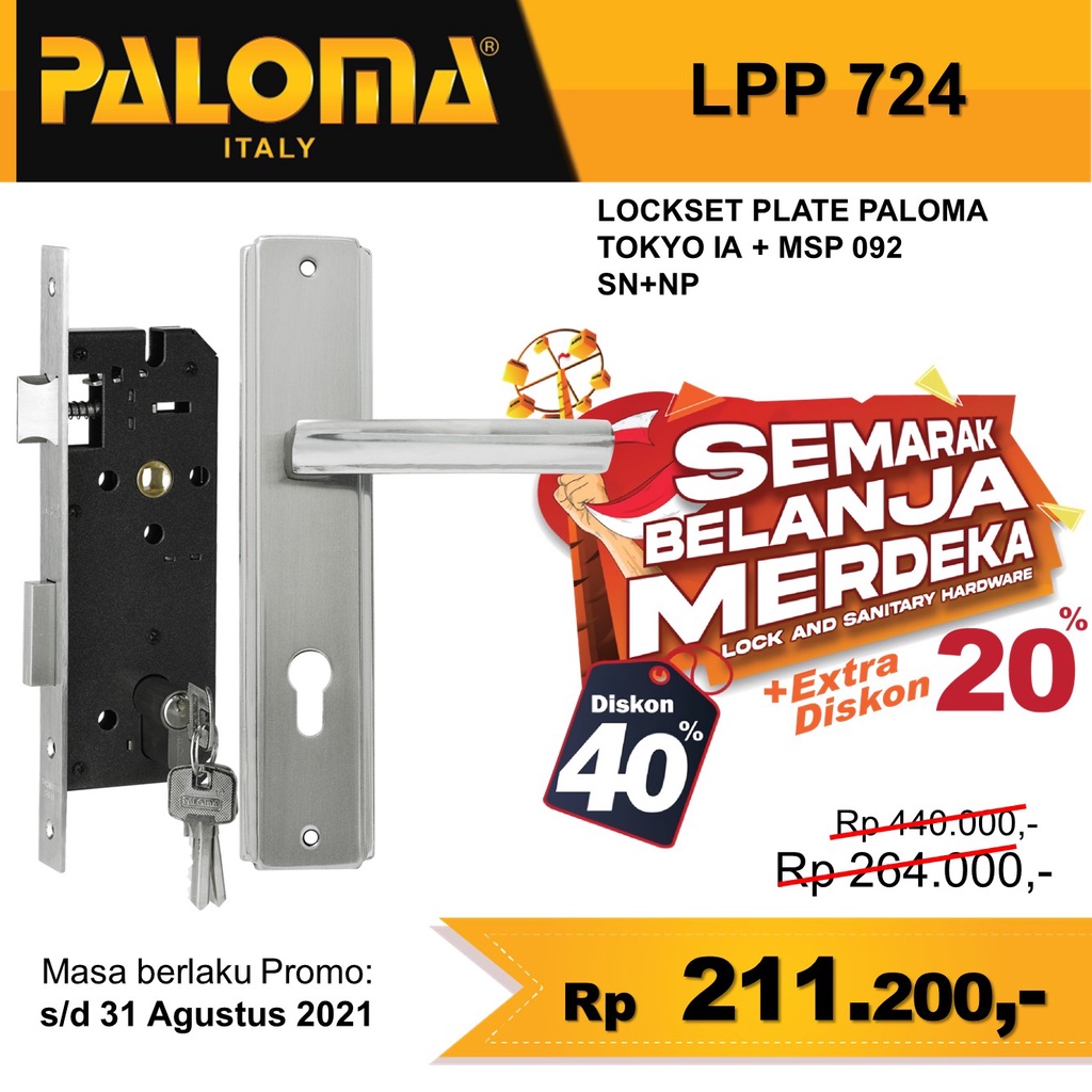 Handle Pintu Plate PALOMA.Kode : LPP 724- Warna : Satin Nickel + Nickel Plated.- Material : Aluminium Alloy Grade 6063-T5. Tahan Karat & Korosi.- Finishing Technology : Teknologi Electroplating.- Warranty : 5 Tahun Garansi Mekanik.- Heavy Duty.Mortise Lock / Lockcase / Body Kunci PALOMA.Medium duty mortise lock.For moderate frequency of use such as for doors in residential properties.Suitable for wooden door mass up to 100kg.5 Years Mechanical Warranty.Designed according to European standards.Backset : 40mm.Mechanical : Medium duty internal mechanism.Latchbolt : Steel. Reversible. Cylinder activated.Deadbolt : Steel . Double throw.Faceplate : Stainless SteelStrikeplate : Stainless Steel. Strikebox included.Casing : Steel, painted. Closed case.Spindle Hub : Steel. Square shaped.Double Cylinder / Kunci Silinder Double (Standard Key) PALOMA.Medium duty, for moderate frequency of use such as for doors in residential buildings.Galvanized body, rust and corrosion resistant.Standard key on both sides.5 Years Mechanical Warranty.Designed according to European standards.Shell & Plug : Zamak-3.Pin : Brass, 5 pins.Cam : Hardened steel.Key : Brass standard-key, nickel plated. 3 keys incl
