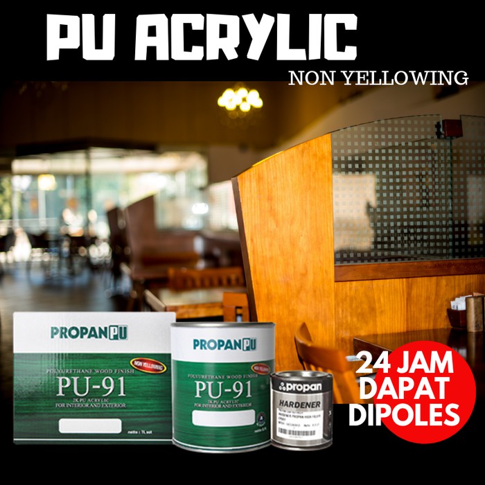 Propan PU Acrylic Non Yellowing PUL-91 adalah PU Varnish (clear coat) yang sangat jernih dan tidak menguning. Sangat tepat digunakan untuk clear coat warna-warna muda.Application StepBase Coat : PU Sanding Sealer PUSS - 91Top Coat : PU Lacquer PUL - 91 (Clear Gloss/Semi Gloss/Dof)1. Aplikasikan PU Sanding Sealer PUSS - 91 (Rasio pencampuran A : B : Thinner = 4 : 1 : 2-3) dengan coating amount 100-120 g/m2 (spray). Biarkan mengering selama 3-4 jam. Amplas dengan kertas amplas no.400. Ulangi lagi proses yang sama untuk lapisan kedua dan ketiga.2. Aplikasikan PU Lacquer PUL-91 (Rasio Pencampuran A : B : Thinner = 4 : 1 : 2-3) dengan coating amount 100-120 g/m2(spray). Biarkan mengering selama seh