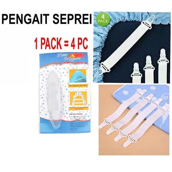 Isi 1 pax = 4 pcs (pas untuk 4 sisi kasur)Bahan : Karet elastis dan plastikPanjang +/- 22cmSprei kasur sering lepas? Ini solusinya, dengan penjepit sprei, walaupun sang buah hati suka lompat-lompat di kasur, sprei akan tetap rapi dan tidak lepas lagi dari kasur.Apakah setiap bangun tidur anda harus mengerjakan rutinitas merapikan sprei. Sprei yang terpasang di kasur seringkali sudut-sudutnya mudah lepas atau terangkat sehingga harus dirapikan terus, rutinitas yang membosankan.Gak perlu repot, karet jepitan sudut sprei siap membantu anda. Anda gak perlu repot lagi bolak balik tarik sprei, irit waktu dan tenaga.Karet jepitan sudut sprei adalah karet yang di kedua ujung terdapat klip jepitan. Fungsinya untuk dijepit di sudut sprei agar sudut sprei tidak mudah terangkat (pemakaian seperti terlihat di gambar).Dengan karet jepitan sudut sprei, sprei jadi terpasang rapi, sudut-sudutnya gak bakal lepas atau terangkat, gak perlu buang waktu untuk mengerjakan rutinitas merapikan sprei. Bisa dipasang di semua tipe