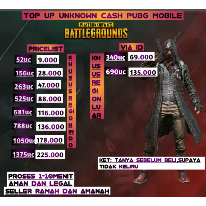 SELALU READY STOCK_______________________Syarat Order :Nomor ID :Nick :Order uc :**JIKA NICK SUSAH .. KOSONGI SAJA BAGIAN NICK NYA________________________________________cara order :1. Tulis ID di chat2. Klik beli sekarang3. Pilih U C4. Klik keranjang5. klik checkout6. pilih Metode Pembayaran ( Indomart, Alfamart, Transfer , dll)7. klik buat pesanan8. lunasi pembayaran9. stelah itu order akan dikirim ke akun kk.. mohon ditunggu 1-5 menit10. DONE = Order kamu telah selesai dikirim11. 5 jam kemudian Mohon untuk klik penerimaan pesanan di order taditerimakasih .. sehat selalu