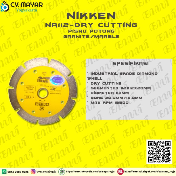 Diamond Blade Nikken Resibon NR112 Cutting Special for Marble / Granite.Industrial grade diamond wheel.Designed for industrial applications.Lasts upto 100 times more than abrasive wheels- Fully hardened and heat treated steel core allows whell to cut true.- Industrial diamond grains for highest performance.- Expansion slots minimise wheel overheating and warping.memiliki 2 jenis pisau potong yaitu : - Dry cutting in concrete, marble/granite suitable for portable angle grinders.- Wet cutting in concrete, marble/granite suitable for portable angle grinders.Spec :Segmented 112x12x20mmDiameter 112mmBore 20.0mm/16.0mmMax RPM