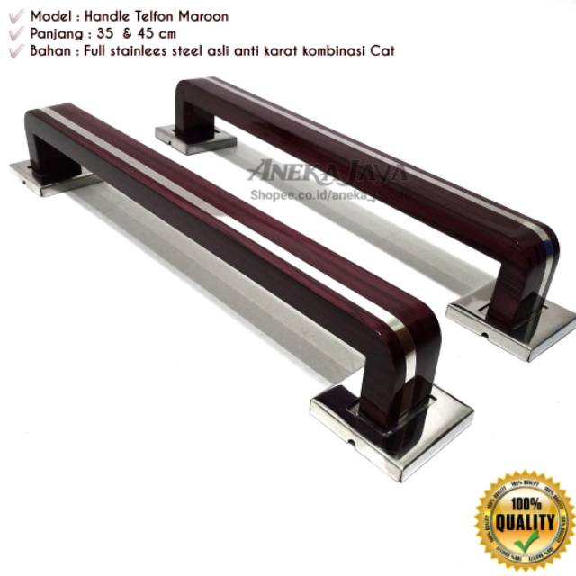 Silakan di order gan Handle Pintu rumah terbaru dari aneka jaya, Supaya pintu anda terlihat Lebih Elegan dan istimewa>> Model : Handle telefon / Gawang>> Warna : Coklat maroon>> Panjang Ready 35 cm & 45 cm>> Bisa Request Panjang*Ke'unggulan Handle Pintu ANEKA JAYA* Memakai Bahan Stainlees stell High Quality 201 karat Lebih tebal & mengkilap, Yang pasti anti karat dan tahan lama Produk Ready Stock Terus Jangan khawatir Kehabisan , minat langsung di order aja gan kaki - kaki handle yang kuat Model Bermacam - macam & Terbaru Harga Lebih terjangkau karena kami produsen langsung menjual ke tangan konsumen.Bisa Request panjang juga sesuai pesanan Silakan chat seller kami untuk panjang melebihi 45 cm, untuk mengaktifkan variasi karena harga & berat berbeda Warna cat Tahan lama, tidak gampang baret n pudar karena bahan cat khusus untuk stainlees steel, setara cat mobilKami menjaga kepuasan pelanggan & Konsumen kami, CATATAN : Hati - Hati Banyak penjual nakal yang memainkan Harga Murah tapi tak sebanding kualitas & Keawetan'nya.. Jadilah pembeli yang cerdas ganSALAM ANEKA J