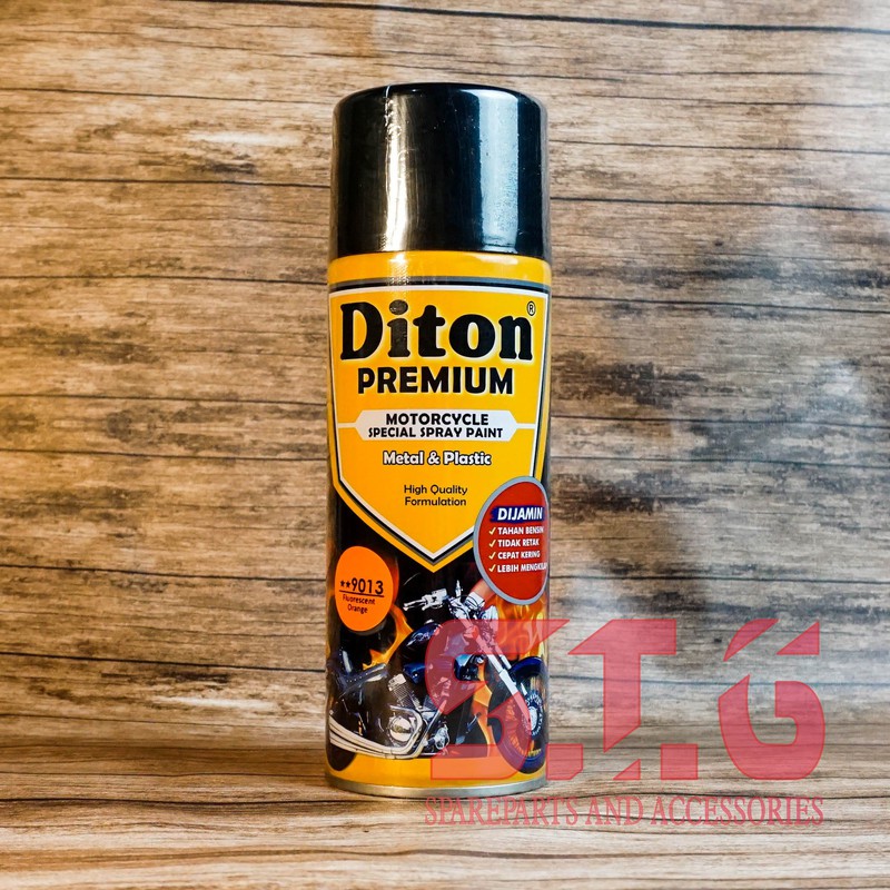 Cat Semprot DITON PREMIUMKHUSUS PULAU JAWA! Tidak bisa dikirim ke luar Pulau Jawa.DITON PREMIUM adalah cat semprot bermutu tinggi yang diformulasikan khusus untuk kendaraan bermotor. cepat kering, tahan bensin, tidak retak dan lebih mengkilap. Diton Premium sudah mengadopsi sistem pada spray gun yang menghasilkan hasil semprotan seperti kipas tidak seperti cat semprot pada umumnya.DITON PREMIUM memberikan ratusan pilihan warna. Warna solid, metallic, candy tone, warna mutiara, fluorescent dan warna logam.DITON PREMIUM memberikan jaminan cat tahan lama, tahan bensin, anti-retak, cepat kering, dan hasil cat yang lebih mengkilap. Keunggulan Cat Diton:1. DITON PREMIUM berbahan dasar thermo plastic acrylic dengan daya lekat yang sangat kuat dan sangat elastis, sehingga dapat disemprotkan pada benda berbahan logam, kayu maupun plastik.2. Warna-warna metalic DITON PREMIUM sangat cocok dan mendekati warna yang digunakan pada semua merek dan jenis kendaraan bermotor dengan hasil akhir Super High Gloss.3. Untuk menghasilkan warna fluorescent yang sempurna dianjurkan memakai warna dasar DITON PREMIUM FLUORESCENT PRIMER 9000 dan untuk membuat cat lebih mengkilap dianjurkan melapisi DITON PREMIUM CLEAR 9128, untuk menghasilkan doff gunakan DITON PREMIUM CLEAR DOFF 9130 atau DITON PREMIUM CLEAR SEMI DOFF 9129.Harga tertera untuk 1 kaleng cat DITON PREMIUM ukuran 400 cc sesuai deskripsi warna.BELI BANYAK LEBIH MURAH DAN HEMAT ONGKIR!Harga Grosir Mulai Pembelian 2 Pcs!Pelanggan mohon baca Catatan Penjual dan Kebijakan Pengembalian Barang kami.Stock produk banyak, siap dikirim ke seluruh Indonesia.Ingin jadi reseller dengan harga khusus? Silakan chat/ PM.Terbuka untuk yang mau dropship juga.Silakan chat/ PM atau ke kolom diskusi jika ada pertanyaan.PENTING:Jadikan steGO toko favorit Anda agar terus terupdate dengan produk terbaru